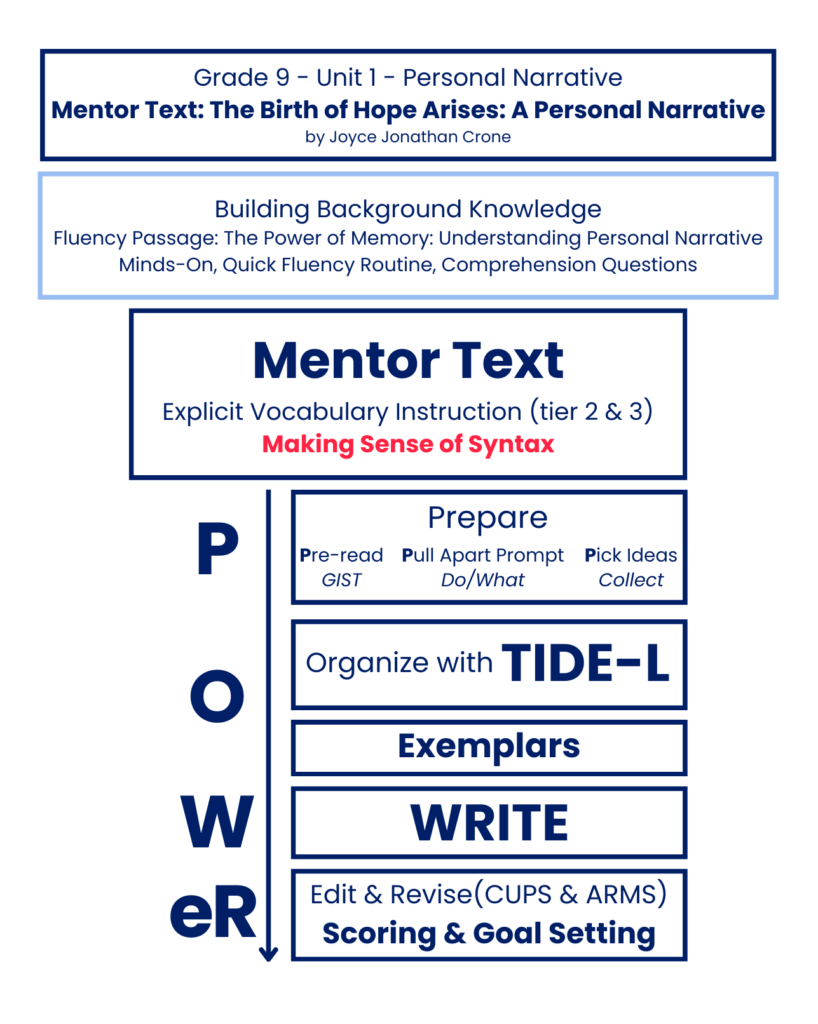 In Unit 1, students learn foundational syntactic skills connected directly to the mentor text The Birth of Hope Arises. The four lessons guide students to identify the essential elements of a complete sentence, recognize and repair fragments, and expand simple kernel sentences using functional questions and answers. As they manipulate sentence structure, students begin to make purposeful decisions about clarity, emphasis and flow.