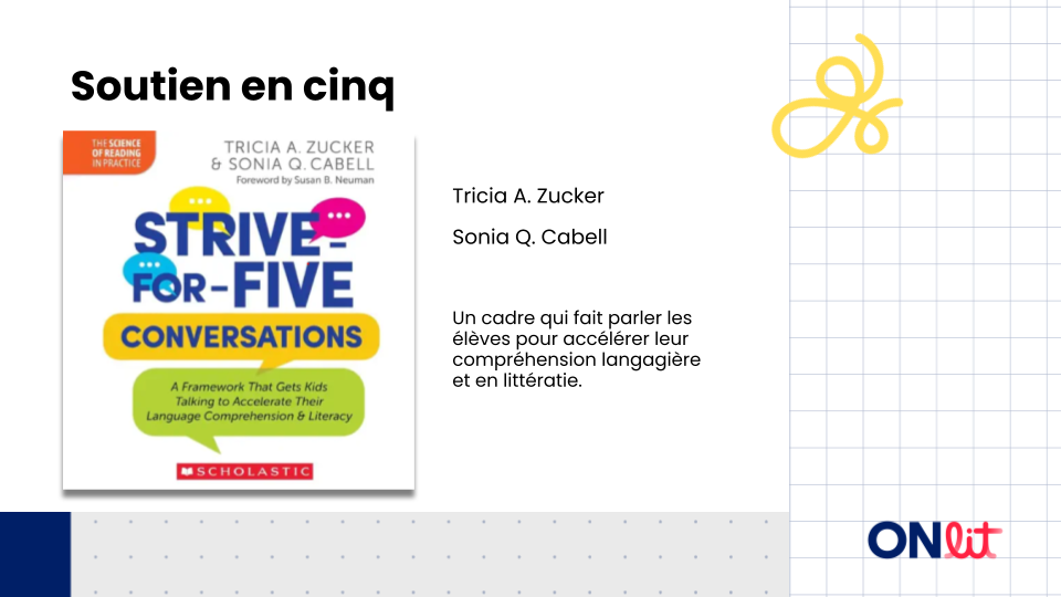 Ces diapos de l’étude de livre explorent les conversations Soutien en cinq (Strive-for-Five Conversations) de Sonia Cabell et Tricia Zucker. Conçue pour le personnel enseignant de la maternelle à la 8e année, cette ressource professionnelle examine comment le cadre Soutien en cinq prolonge les conversations pour enrichir la communication orale et favoriser la compréhension de la lecture. Découvre des exemples pratiques pour intégrer ces stratégies dans votre enseignement pour améliorer l’apprentissage de vos élèves !